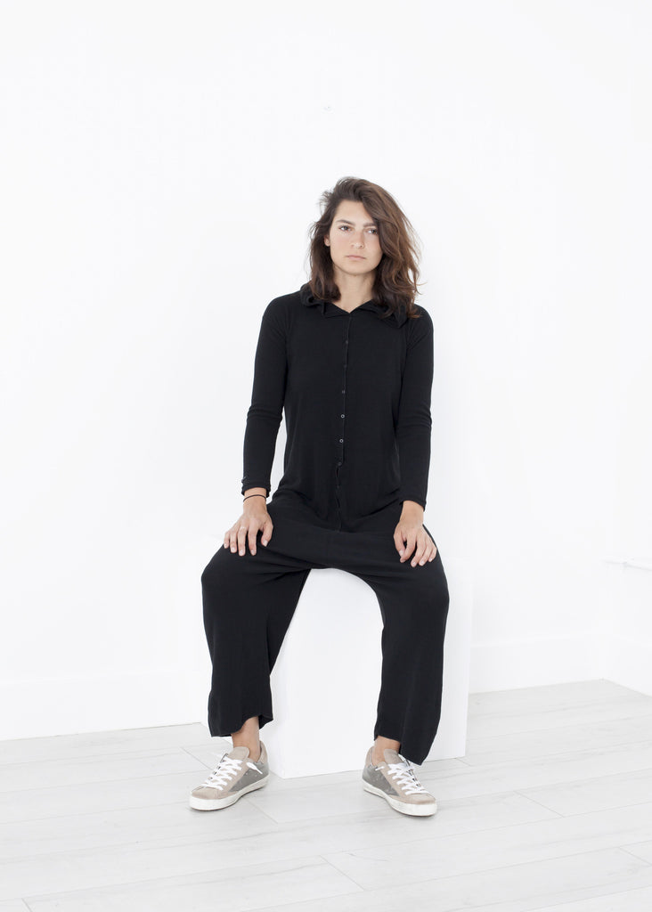 This hooded jumpsuit from Album di Famiglia has baby snaps down the center front and a low slung inseam making ease the priority. Back patch pockets and a slightly cropped length. Color Black. 34% Cotton, 29% Viscose, 19% Polyamide, 14% Angora, 4% Elastane. Lana is wearing a size Small.